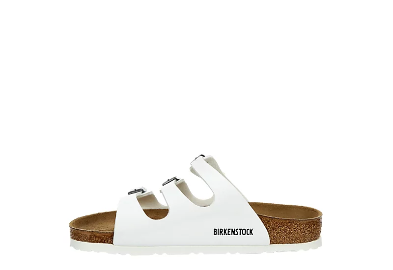 Take on the tropics in the easygoing Florida women’s soft footbed sandal from Birkenstock. Crafted using faux leather featuring adjustable buckle straps for a custom fit, this slip-on sandal has a suede lining for a nice feel. The additional foam layer works with the cork to pamper your foot, while the textured EVA outsole offers some traction.