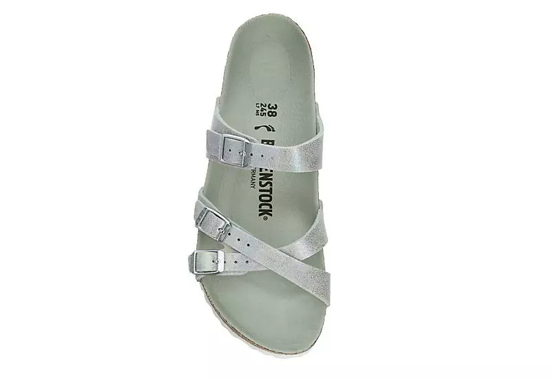 Style your summer in the elegant Birkenstock Franca Vegan women’s footbed sandal. With a vegan iridescent microfiber upper featuring slim, crisscross straps for modern style, this buckle strap sandal is a great accessory for travel or lounging around the backyard during a staycation. The cork-latex footbed and microfiber lining cradle your foot with soothing comfort, while the EVA sole offers stability and durability.