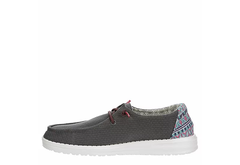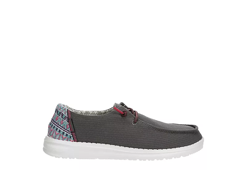 Relax into your passion with the HEYDUDE Wendy Aztec women’s slip-on sneaker. With a soft canvas upper featuring a contrasting heel detail and elastic laces for a secure fit, this slip-on sneaker is machine washable for easy maintenance. The removable Memory Foam insole and leather lining offer ergonomic comfort and cushioning, while the ultralight outsole lets you explore unfettered.