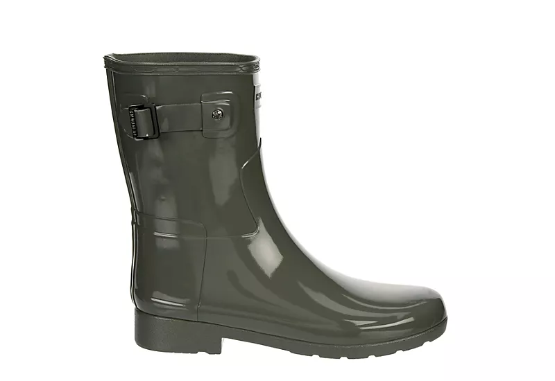 Elevate your rain style in the Hunter Original Refined Short Gloss women’s rain boot. With a handcrafted, natural vulcanized rubber upper featuring a gloss finish for shiny, waterproof style, this lightweight pull-on rain boot has a slimmer fit for a more tailored profile. The polyester lining soothes while the rubber outsole has Hunter Refined tread pattern for traction.